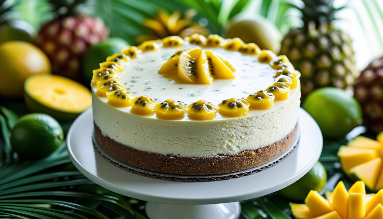 Top the cheesecake with fresh passionfruit pulp, lime zest, or mint leaves for a beautiful finish. You can also serve it with a berry coulis, tropical fruit slices, or a dollop of whipped cream to enhance presentation and flavor.
